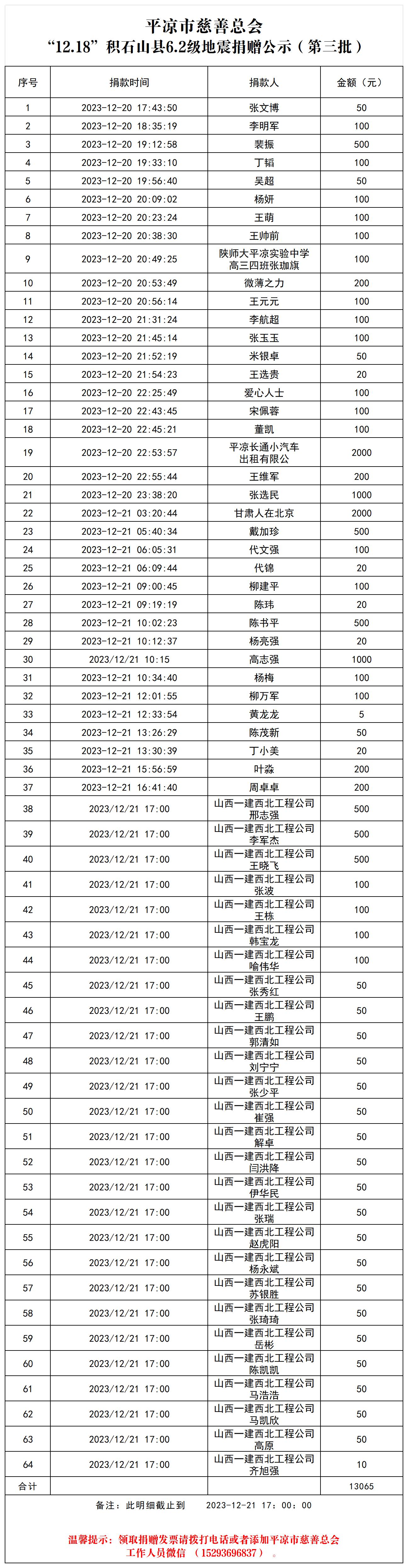 北京时间2023年12月18日23时59分,甘肃临夏州积石山县发生6.2级地震,震源深度10公里。 面对突发灾情,全市社会各界积极响应,充分发扬“一方有难,八方支援”的社会主义互助精神,帮助受灾群众渡过难关。现将截止2023年12月21日17:00分的第三批捐赠信息予以公示。