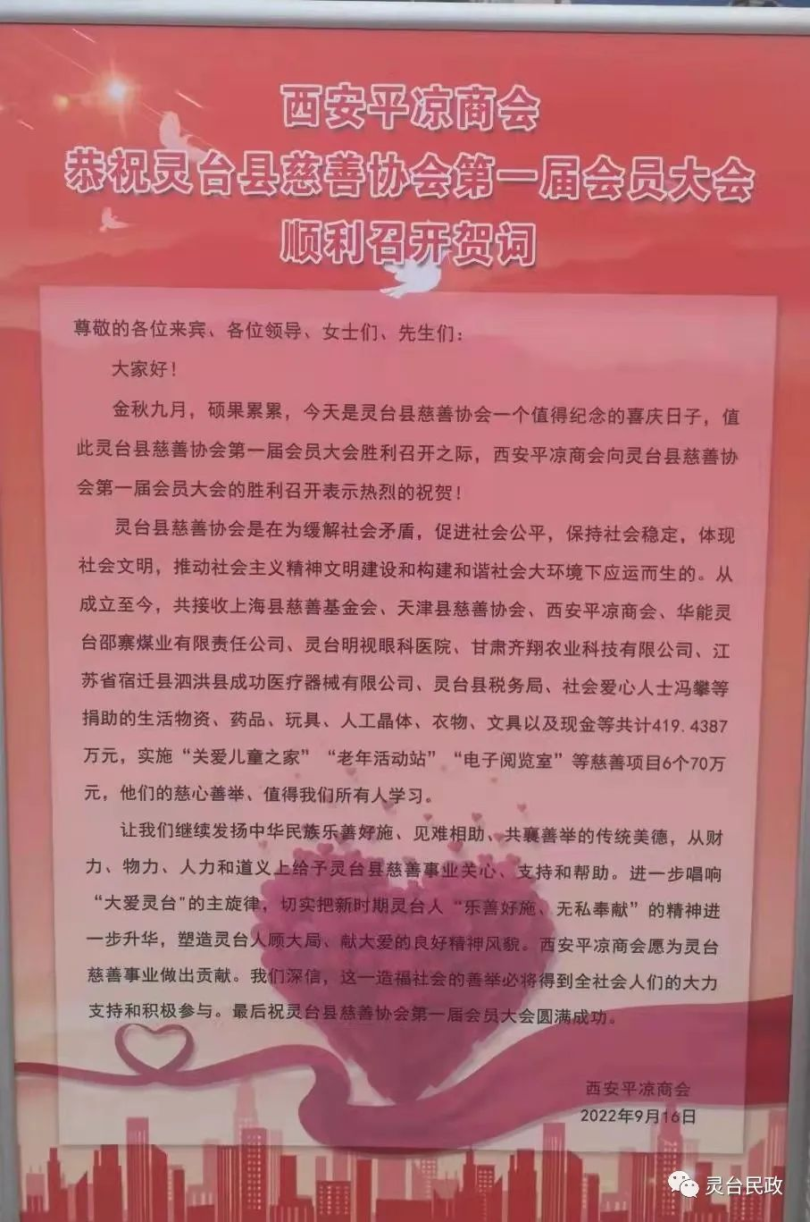 平凉市慈善总会负责人吴宗在致辞中表示,灵台县第一届慈善协会会员大会的召开,标志着灵台县慈善工作迈上新的历史阶段,希望灵台县慈善协会坚持依靠人民办慈善、办好慈善为人民的工作方针,加强与市内外慈善机构的合作,完善救助网络,开展多种形式的救助活动,造福灵台人民。